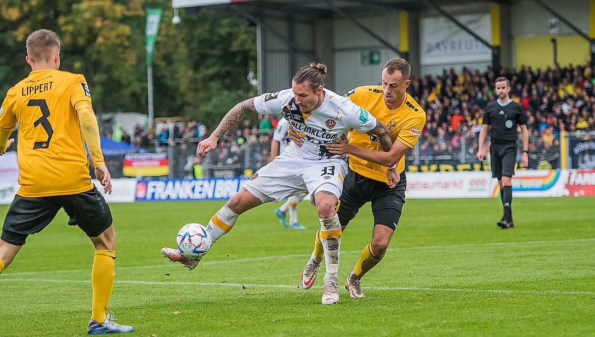Mit knapp 15 Minuten Verzögerung – ein Fanzug aus Dresden hatte sich verspätet – begann die Partie im Hans-Walter-Wild-Stadion vielversprechend: Nachdem Bayreuth mit aggressivem Pressing in die Begegnung gestartet war, spielte die SGD den ersten richtigen Angriff direkt sauber aus. Michael Akoto überwand im Dribbling viel Raum und steckte auf Manuel Schäffler durch, dessen leicht abgefälschter Abschluss im Netz zappelte und Dynamo die frühe 1:0-Führung bescherte (6.).