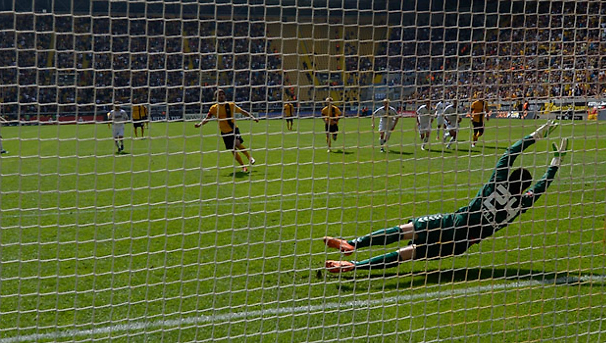 Dynamo hatte nach wenigen Sekunden gleich die ersten Tormöglichkeiten der Begegnung. Koch zog nach Ballgewinn tief in der Hälfte der Gäste ab, bekam aber nicht den nötigen Druck hinter den Ball. Potés Schuss aus spitzem Winkel ging knapp am Pfosten vorbei. Fünf Minuten waren gespielt, als Schiedsrichter Martin Petersen einen folgenschweren Pfiff tätigte. Brégerie bekam den Ball an der Grundlinie des Dresdner Strafraums ins Gesicht geschossen. Der Unparteiische sah aber ein Handspiel und entschied zum Entsetzen der Dresdner Anhänger auf Elfmeter. Rouwen Hennings ließ sich die Chance nicht entgehen und traf vom Punkt zur 1:0-Führung der Gäste (6.).