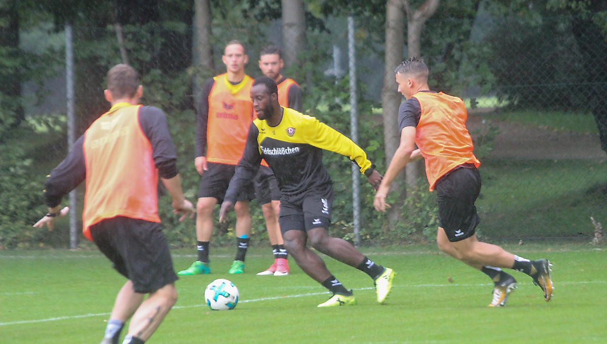 Länderspielpause gleich Ruhepause? Nicht bei der SGD. Cheftrainer Uwe Neuhaus lässt seine Mannschaft auch während der bundesligafreien Zeit ordentlich schwitzen. Nach einer kräftezehrenden Doppelschicht inklusive Sprinteinheit am Vortag, bat der 57-Jährige auch am Donnerstag zweimal zum Training.Bei anhaltendem Regen und unter den Augen des ehemaligen Bundesliga-Spielers und jetzigen Nachwuchsleiters des FC Energie Cottbus, Matthias Heidrich, arbeiteten die Schwarz-Gelben an ihrem Spielaufbau und dem Passspiel. Heidrich hospitiert im Rahmen seiner Ausbildung zum Fußballlehrer seit zwei Wochen bei der SGD. Mit dabei war auch Justin Löwe, der seine Sprunggelenksverletzung auskuriert hat.