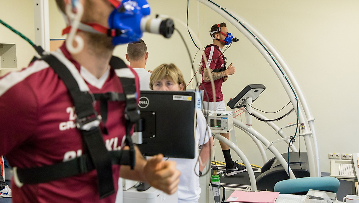 Beim sogenannten „Rampentest“ kommen die Dynamo-Profis ordentlich ins Schwitzen. Auf dem Laufband wird die Geschwindigkeit und damit die Belastung stufenweise immer weiter erhöht, um die maximale Sauerstoffaufnahme jedes einzelnen Akteurs exakt bestimmen zu können.