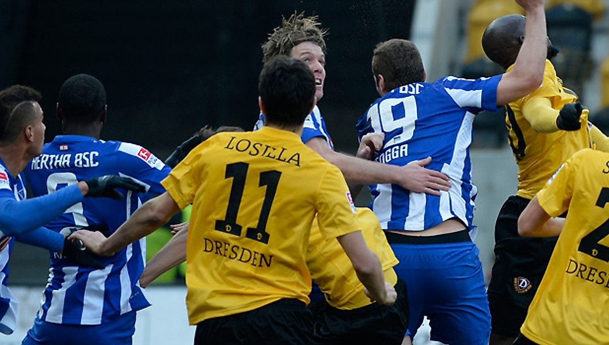 Mit einer Standardsituation gingen die Schwarz-Gelben nach 39 Minuten in Führung. Cristian Fiel hatte einen Freistoß von rechts in den Strafraum gebracht, wo gleich mehrere Spieler der Berliner und der Hausherren nach oben sprangen. Am nächsten dran waren Mickael Poté und Pierre-Michel Lasogga, der den Ball per Kopf am eigenen Keeper vorbei ins Tor beförderte. Zwar wurde im Stadion der Dynamo-Stürmer frenetisch als Torschütze gefeiert, weil er nach ganz langer Zeit endlich mal wieder ins Schwarze getroffen hatte, doch offiziell wurde der Treffer als Eigentor gewertet. Das sollte der guten Stimmung im Rund allerdings nicht schaden, denn sowohl Pacult als auch der Gästetrainer lobten nach Abpfiff die Unterstützung der Fans. "Dynamo ist über sich selbst hinausgewachsen", meinte Luhukay zur Leistung der Gastgeber und sprach von einer verdienten Führung zur Halbzeit.