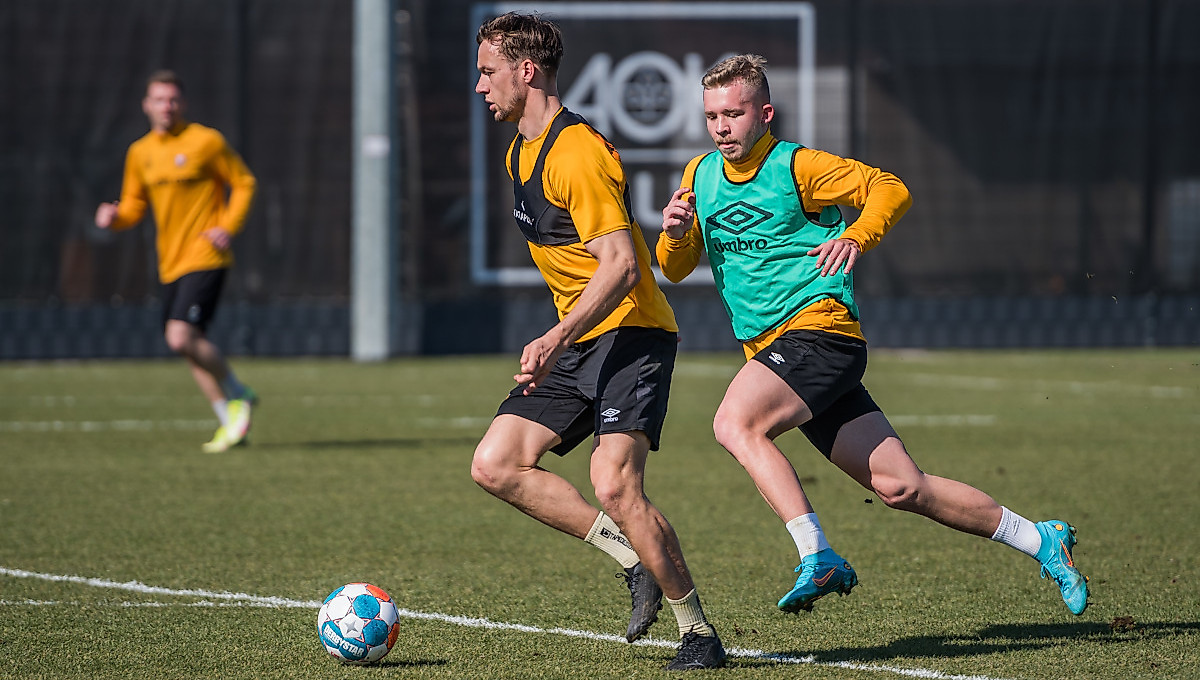 Die Sportgemeinschaft muss in diesen Tagen ganz besonders zusammenhalten: Am Mittwochnachmittag waren etwa 70 Fans in die AOK PLUS Walter-Fritzsch-Akademie gekommen, um die öffentliche Trainingseinheit der Mannschaft von Cheftrainer Guerino Capretti hautnah zu verfolgen.Nach einer Erwärmung unter Anleitung von Athletik- und Konditionstrainer Matthias Grahé arbeiteten die Schwarz-Gelben, die bereits am Vormittag in intensiven Spielformen trainiert hatten, im Zwei-gegen-Zwei auf große Tore an Zweikampfverhalten, Torabschluss und Handlungsschnelligkeit.