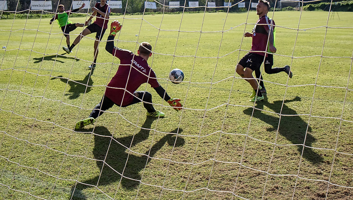 Denn gerade vom „Eckigen“ waren an diesem Morgen zehn Stück über den ganzen Platz verteilt aufgestellt. So ging es mit mehreren Abschlussübungen und Spielformen auf vier kleine, vier mittelgroße und zwei große Tore. Torhüter und Feldspieler legten sich gleichermaßen ins Zeug, um die Trainingsinhalte der vergangenen Tage auf den Platz zu bringen.