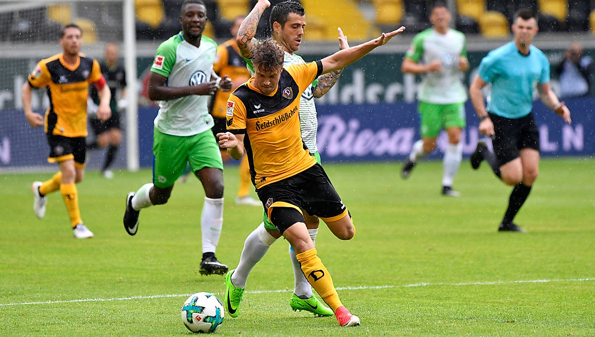 Die SG Dynamo Dresden unterliegt Bundesligist VfL Wolfsburg in der Generalprobe zur Saison 2017/18 am Samstagnachmittag mit 3:4 (2:4). Acht Tage vorm Liga-Auftakt gegen den MSV Duisburg sahen 10.035 Zuschauer im DDV-Stadion eine turbulente erste Halbzeit. Konrad traf per Volleyabnahme nach einer Ecke von Kreuzer (1:0, 10.), Testroet erhöhte nach Vorlage von Heise (2:0, 18.).Dynamo kombinierte immer wieder sehenswert nach vorn, präsentierte sich in der Folge in der Defensivarbeit aber zu nachlässig. Die Mannschaft von Trainer Andries Jonker stellte innerhalb von knapp 15 Minuten auf 2:4 aus Dynamo-Sicht.