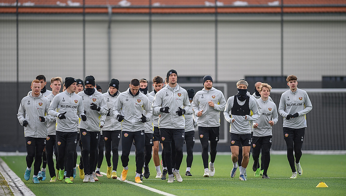 Die Drittliga-Mannschaft der SGD ist am Montag mit einem öffentlichen Training ins Jahr 2023 gestartet. Rund 200 Dynamo-Fans schauten sich die etwa 100-minütige Einheit in der AOK PLUS Walter-Fritzsch-Akademie an.