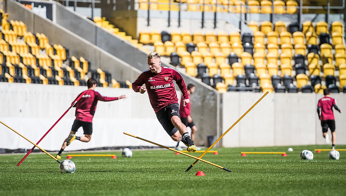 Am Mittwoch nahmen die Zweitliga-Profis der SG Dynamo Dresden unter Einhaltung strikter Regeln des Sächsischen Staatsministeriums des Innern (SMI) im Rudolf-Harbig-Stadion wieder gemeinsam das Training auf, nachdem dieses aufgrund der Kontaktbeschränkungen in der Corona-Krise seit dem 12. März nur individuell stattfinden konnte.Dazu wurde der Kader zunächst in zwei große Gruppen unterteilt, die bis auf Weiteres zu unterschiedlichen Zeiten um 10 und 14 Uhr trainieren werden. Darüber hinaus wurden diese beiden Mannschaftsteile nochmals in mehrere Kleingruppen mit jeweils drei festen Trainingspartnern gegliedert.