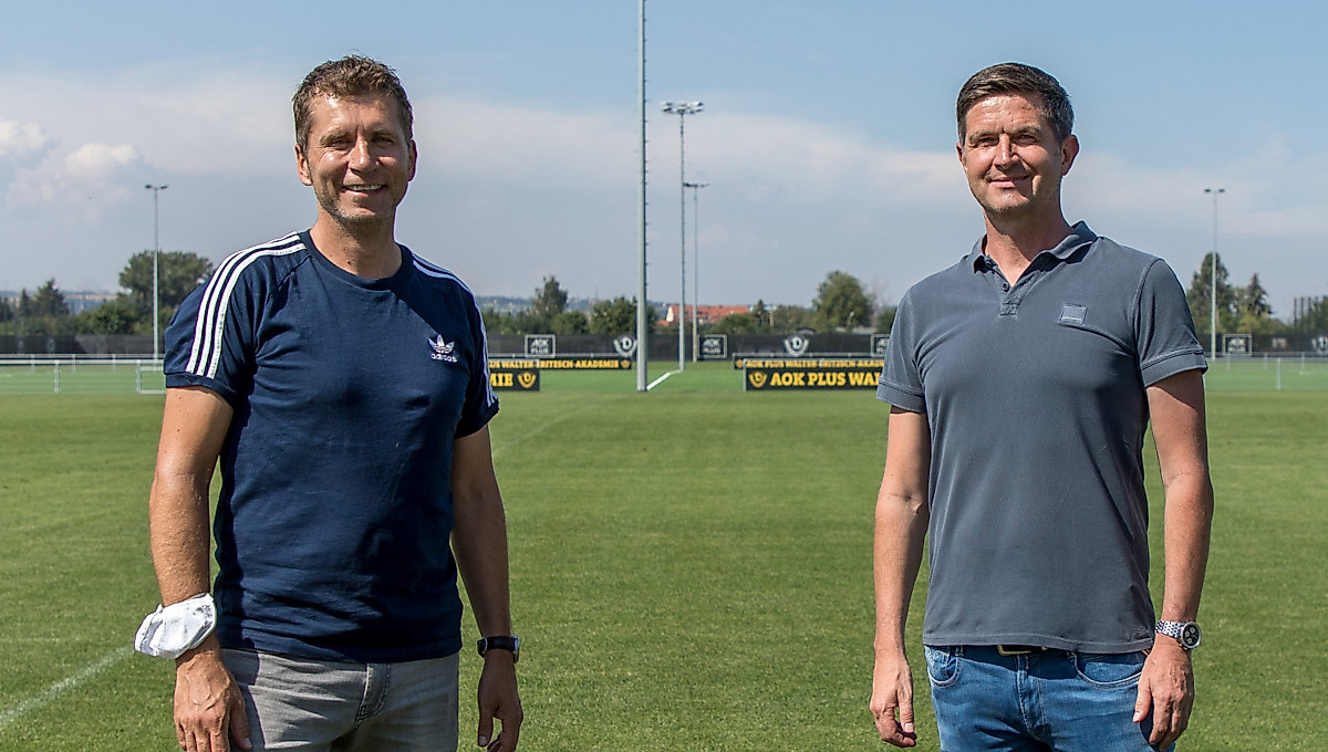 Sportgeschäftsführer Ralf Becker begrüßte mit dem Cheftrainer der U19-Nationalmannschaft Guido Streichsbier einen besonderen Gast in der AOK PLUS Walter-Fritzsch-Akademie. Beide tauschten sich über verschiedene Inhalte aus und verfolgten nebenbei die Übungseinheit der Kauczinski-Schützlinge.