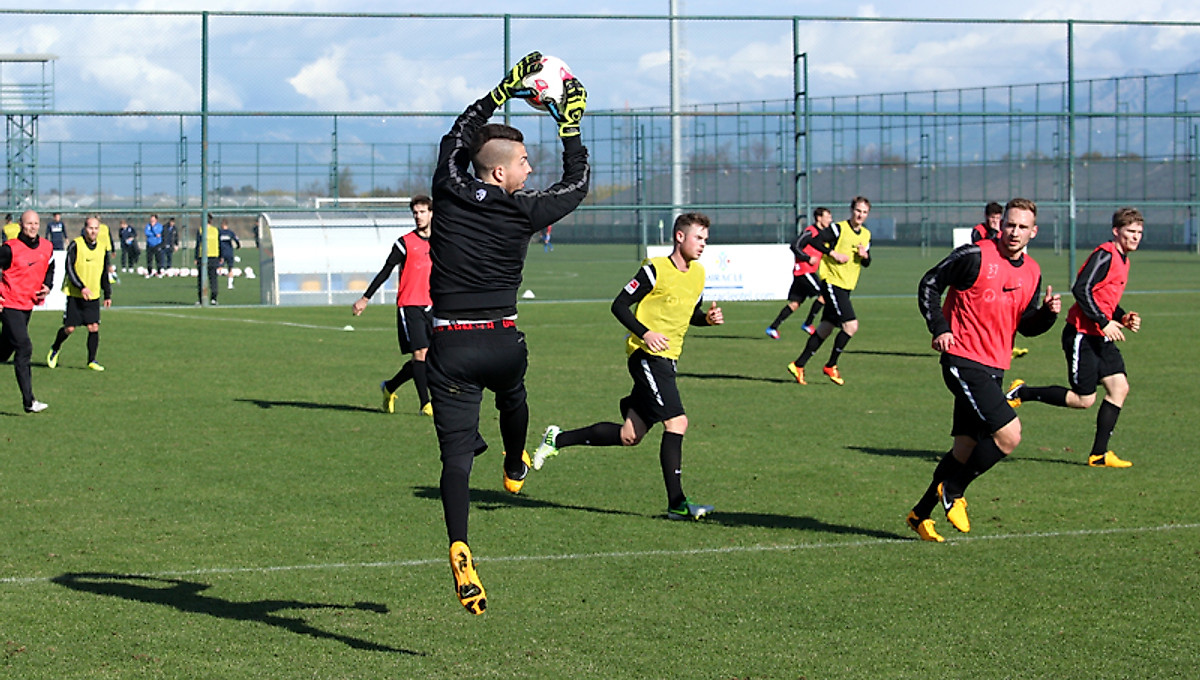 Seit Sonntag läuft das Trainingsprogramm im türkischen Vorbereitungs-Camp auf vollen Touren. Um 9.30 Uhr versammelte Dynamos Cheftrainer Peter Pacult sein Team erstmals auf dem hoteleigenen Trainingsgelände wenige Kilometer vom Mannschaftsquartier entfernt. Die zweite Einheit des Tages fand um 15.30 Uhr auf der Trainingsanlage unmittelbar bei der Mannschaftsunterkunft statt. Das nachmittägliche Training dauerte noch einmal etwas mehr als zwei Stunden und war sehr intensiv. Den Schwarz-Gelben boten sich sowohl am Vormittag als auch am Nachmittag perfekte Rahmenbedingungen: Umgeben von malerisch-charmanter anatolischer Einöde, zeigte sich das Wetter zu dieser Jahreszeit direkt von seiner schönsten Seite – 20 Grad und Sonnenschein. Der Trainingsplatz in Lara präsentierte sich ebenso in einem hervorragenden Zustand: Das Grün ist dicht gewachsen, der Platz ist eben und der Ball rollt zur Freude der Dynamo-Profis schnell auf dem Untergrund.