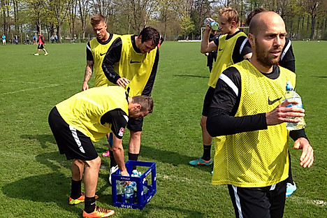 Doch einen Haken hatte die Auftaktfreude am Ende dann doch noch: Pikanterweise und zur Überraschung aller trudelten eine halbe Stunde nach den Dresdnern auch die Profis des MSV Duisburg auf dem Gelände ein. „Das war so von beiden Seiten natürlich nicht geplant“, sagte Peter Pacult anschließend und erklärte, warum es die Duisburger dennoch auf Dynamos Trainingsgelände verschlagen hat: „Der MSV wohnt in einem anderen Hotel und sollte eigentlich auch auf einem anderen Platz trainieren, aber da dieser in einem schlechten Zustand ist, hat deren Veranstalter sie offensichtlich auf einen der freien Plätze auf unserem Gelände vermittelt.“