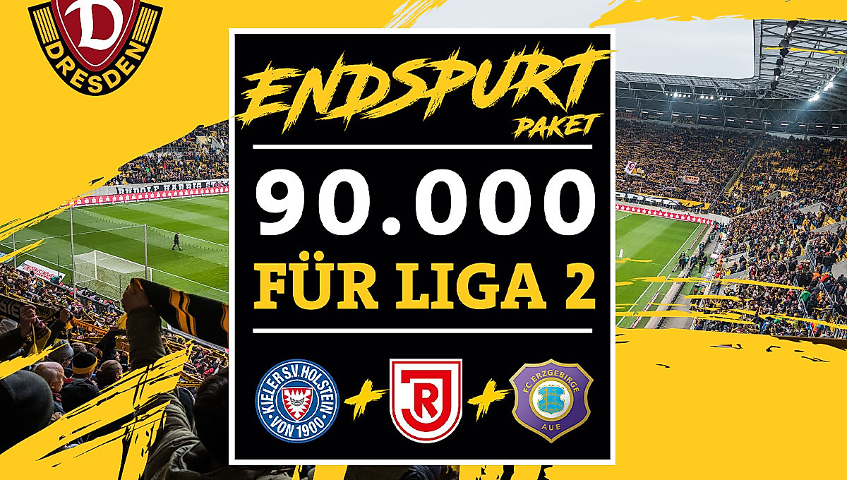 Besonders diesmal: Die SGD bietet neben den Kiel-Tickets auch ein „Endspurt-Paket“ an, welches Euch die Möglichkeit gibt, schon jetzt Tickets für alle drei noch ausstehenden Heimspiele dieser Saison zu sichern!Dynamo-Fans können ein Kombi-Ticket für die letzten drei Heimspiele gegen Kiel, Jahn Regensburg (30. April, 13.30 Uhr) und den FC Erzgebirge (15. Mai, 15.30 Uhr) erwerben und unseren Schwarz-Gelben im Saisonfinale lautstark den Rücken stärken.