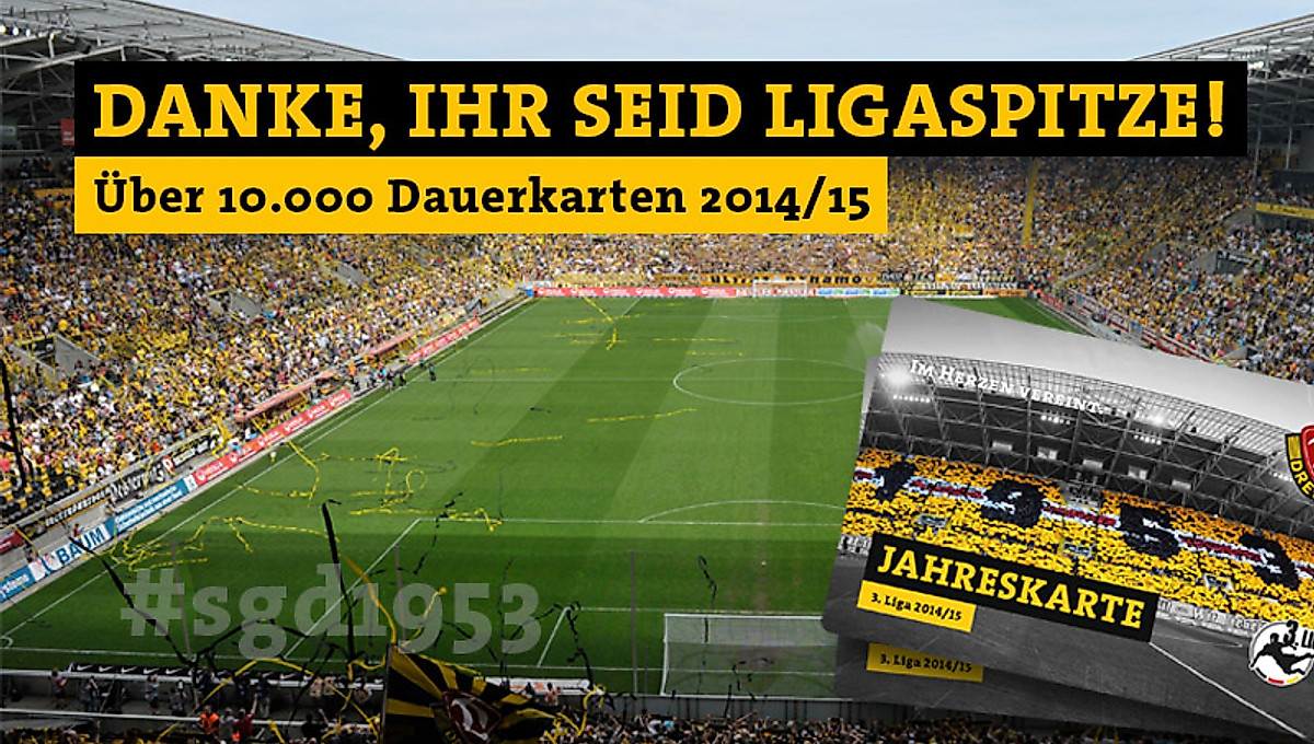 Die SG Dynamo Dresden hat für die Saison 2014/15 bisher über 10.000 Jahreskarten abgesetzt. Damit haben die Fans der Schwarz-Gelben für einen Dauerkartenrekord gesorgt: In der 3. Liga verzeichnete die SGD nie zuvor mehr Stammpublikum. Mit über 10.000 abgesetzten Jahreskarten für die Spielzeit 2014/15 hat die SG Dynamo Dresden mit großem Abstand die meisten Dauerkarten aller Drittligisten verkauft. „Die Unterstützung unserer Fans sucht ihresgleichen. Was wir erleben, ist ein kraftvoller gemeinsamer Neustart“, freut sich Dynamos Geschäftsführer Robert Schäfer.Am Samstag erwartet die Sportgemeinschaft den VfB Stuttgart II zum ersten Punktspiel der Saison 2014/15. Für die Partie wurden bereits über 16.000 Karten verkauft. Wer sich seinen Platz im Stadion für die gesamte Spielzeit sichern und es den mehr als 10.000 Dauerkarteninhabern gleichtun will, hat dazu am Samstag noch einmal die Gelegenheit. Im Kassenbereich Lennéplatz könnt ihr von 10 bis 12 Uhr eure Jahreskarte 2014/15 erwerben. Auch nach Abpfiff besteht dazu noch einmal die Möglichkeit.