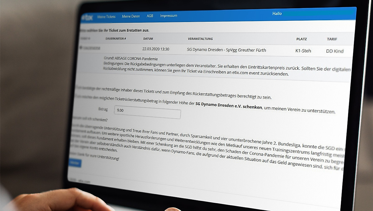 Wichtig: Es müssen sich alle Ticketinhaber, die über ihre Karte(n) per Schenkung, Teilschenkung oder Erstattung entscheiden möchten, vorab auf der etix-Plattform registrieren. Wer den Zweitmarkt, das etix Dynamo-Konto zum Jahreskartenkauf oder den Tageskartenkauf mit seiner E-Mail-Adresse schon genutzt hat, ist nicht automatisch registriert, da es sich bei der neu geschaffenen Ticketplattform um ein eigenständiges Angebot handelt.