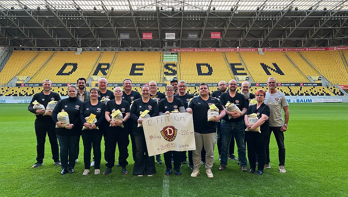 Das Ergebnis der zwölfwöchigen Arbeit konnte sich schlussendlich im wahrsten Sinne des Wortes sehen lassen. Alle hatten es geschafft, die Umstellung vorzunehmen und dabei den inneren Schweinehund besiegt. Das Gruppenergebnis wies sogar einen Rekord auf: Insgesamt konnten die 20 Fußballfans 194,6 Kilogramm an Gewicht abbauen. Im Kurszeitraum legten sie 20.819.300 Schritte zurück und verloren 2,26 Meter an Bauchumfang. Davon war nicht nur Trainer Holger Hums begeistert, auch der ehemalige Dynamo-Torwart Patrick Wiegers drückte den Teilnehmerinnen und Teilnehmern seinen Respekt aus, als er diesen gepackte Sandsäcke analog dem reduzierten Gewicht überreichte. Dabei sprach er allen nochmal motivierende Worte zu und betonte den Stellenwert eines solchen Angebots im Verein.