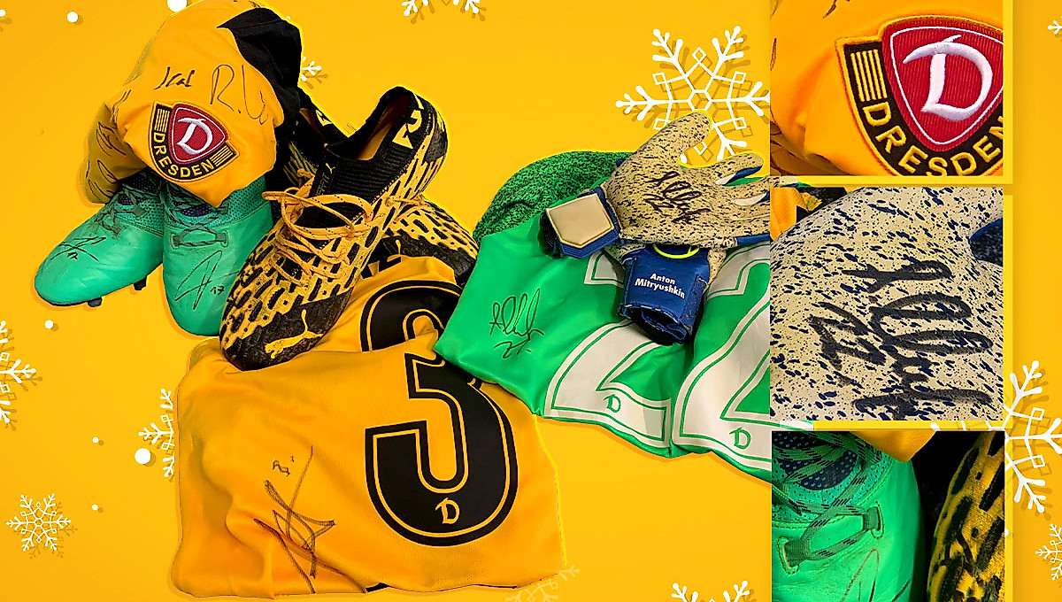 Dazu beinhaltet das erste Paket vom Schlussmann der SGD getragene sowie von ihm ebenfalls unterschriebene Torwarthandschuhe. Im zweiten Paket sind von Michael Akoto getragene und signierte Fußballschule dabei, während Paket Nummer drei mit den getragenen und unterschriebenen Fußballschuhen von Morris Schröter aufwartet.