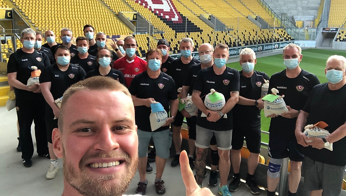 Um diesen Erfolg gebührend zu würdigen, kamen die SGD-Mitglieder vor Kurzem tagesaktuell negativ auf Covid-19 getestet im Rudolf-Harbig-Stadion zusammen, wo Kursleiter Holger Hums und als Überraschungsgast SGD-Kapitän Sebastian Mai ihnen gefüllte Sandsäcke als Symbol der erreichten Gewichtsreduzierung überreichten.