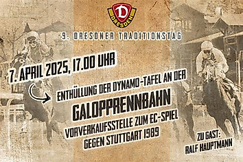 Am Montag, dem 7. April 2025, enthüllt die SGD eine Ehrentafel an der Galopprennbahn Dresden-Seidnitz, an der 1989 schwarz-gelbe Geschichte geschrieben wurde. Neben einer Führung von Dynamos Traditionsbeauftragtem Jens Genschmar habt Ihr die Möglichkeit, mit Präsident Ronny Rehn und Vereinslegende Ralf Hauptmann ins Gespräch zu kommen. Die Enthüllung erfolgt um 17 Uhr.