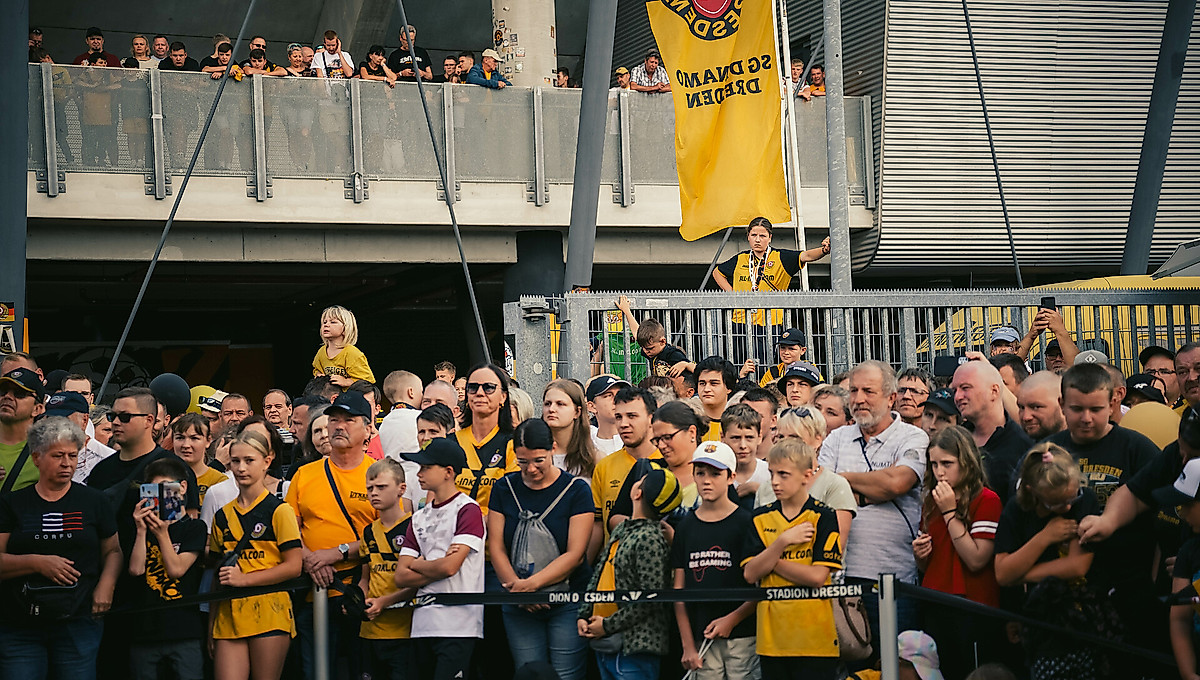 Nach der Kindershow von „Meister Klecks & Spaßimir“ wurde es ab 15.30 Uhr richtig laut bei den über 8.500 Besucherinnen und Besuchern, die damit für einen neuen Besucherrekord sorgten. Dann trat die Mannschaft samt Trainerteam ins Rampenlicht und stellte sich den Fragen von Stadionsprecher Peter Hauskeller. So konnten auch alle Dynamo-Fans die Neuzugänge kennenlernen, die wiederum gleich die Herzlichkeit und Unterstützung der schwarz-gelben Familie zu spüren bekamen.