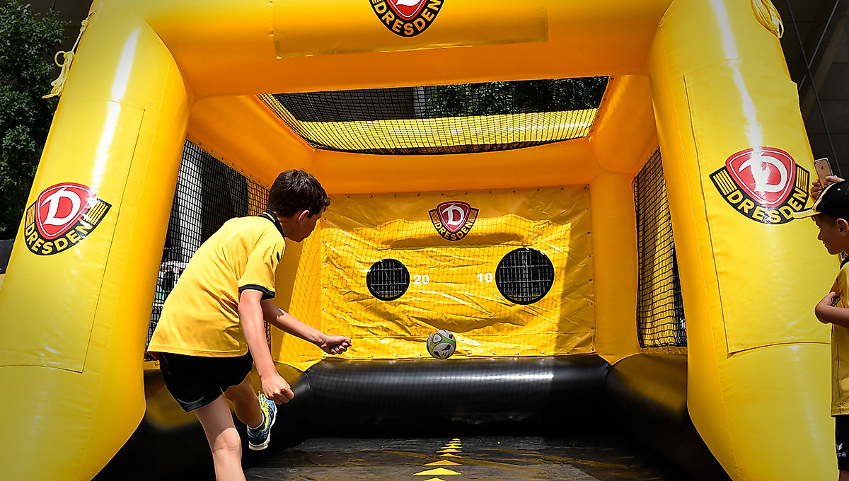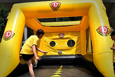 Vom 18. bis 20. August feiert Elbflorenz das 19. Dresdner Stadtfest. Zusammen mit dem „Dresdner Mannschaftsspitzensport“ ist auch die SG Dynamo Dresden beim 811. Jubiläum der sächsischen Landeshauptstadt dabei.Auf einer gemeinsamen Fläche auf dem Altmarkt wenden sich Dresdner SC Volleyball, Dresden Monarchs, Dresdner Eislöwen und die SGD am Samstag und am Sonntag vor allem an das junge Publikum: Jeweils von 10 bis 19 Uhr können Nachwuchssportler an vier Wurf- und Schussstationen ihr Können in den Sportarten Fußball, Volleyball, American Football und Eishockey testen sowie ihre Vielseitigkeit unter Beweis stellen. Am dynamischen „Radarmesser“ könnt ihr testen, wie hart euer Schuss ist.