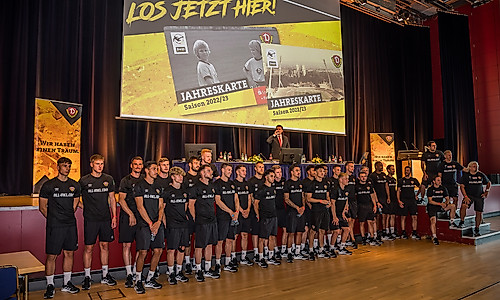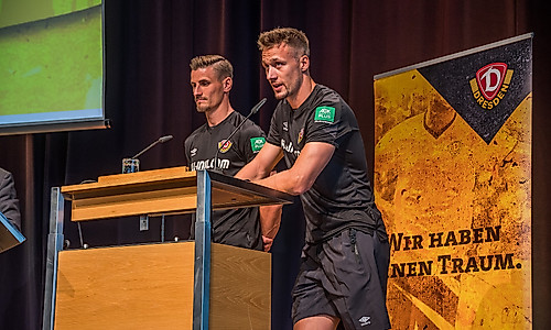 Im Anschluss stellte sich Sportgeschäftsführer Ralf Becker ausgiebig den kritischen Fragen der Versammlung, um gemeinsam die vergangene Saison aufzuarbeiten und nach vorne zu schauen. Danach wurde die Profi-Mannschaft der SGD samt Trainer- und Betreuerstab mit Applaus empfangen.