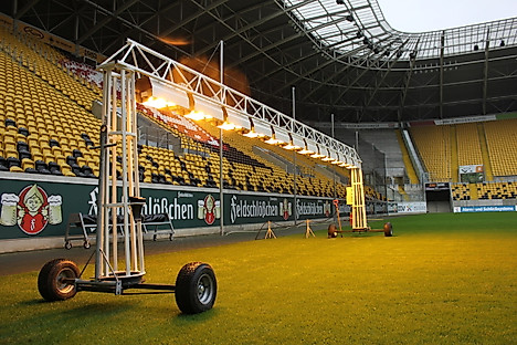 Die Stadion Dresden Projektgesellschaft testet in den nächsten Monaten eine Beleuchtungsanlage für den Rasen im DDV-Stadion. Mit Hilfe der modernen Technologie soll die Qualität des Rasens auch in den Wintermonaten hoch bleiben. Das Grün wird mit künstlichem UV-Licht bestrahlt, damit es in der dunklen und kalten Jahreszeit weiter gedeihen kann. Es wird praktisch Sommerwetter simuliert.Der mobile Beleuchtungskörper der Firma SGL aus den Niederlanden wird in den Bereichen des Spielfelds genutzt, an die kein Sonnenlicht gelangt und an denen der Rasen besonders hoher Belastung ausgesetzt ist – so zum Beispiel im Fünfmeterraum. Die Anlage hält Temperaturen bis zu -30 Grad stand.