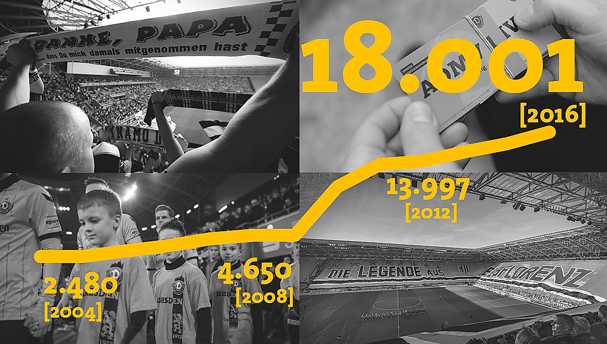 Zum 63. Vereinsgeburtstag am 12. April 2016 hatte die SGD noch 17.151 Mitglieder. Eineinhalb Monate und einen Zweitliga-Aufstieg später ist der Verein um 850 Mitglieder gewachsen. Dynamo erlebt einen Mitglieder-Boom: Seit dem Jahresende 2010 stieg die Mitgliederzahl um 352,9 Prozent von 5.100 auf eben jetzt 18.001. Davon kommt der Großteil aus Deutschland, aber auch in ganz Europa sowie in Australien, Brasilien, den USA und Kanada leben dynamische Mitglieder.