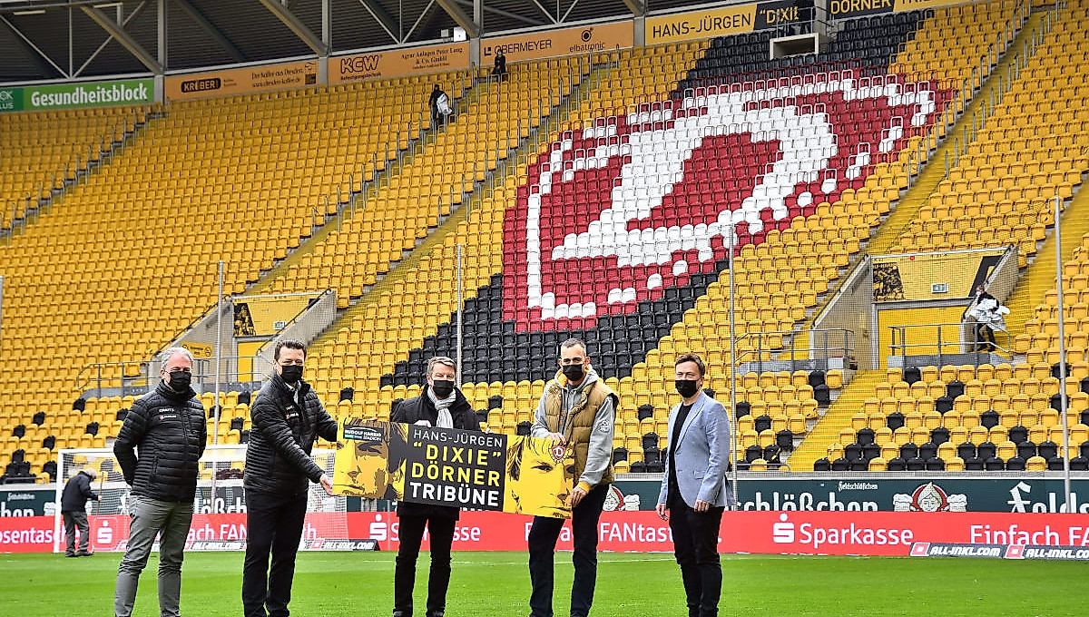 Ab sofort trägt der Bereich der Blöcke T1 bis C5 auf der Südtribüne den Namen von Dynamos Rekordspieler und Ehrenspielführer, was fortan auch, durch die bereitwillige Unterstützung aller 1953-Partner, in großen Lettern neben dem Konterfei des ehemaligen Weltklasse-Liberos in der Mitte des Zuschauerblocks zu sehen ist. Bis zu knapp 5.900 Menschen finden an Heimspieltagen der SGD unter normalen Umständen auf der Dixie-Dörner-Tribüne ihren Platz.