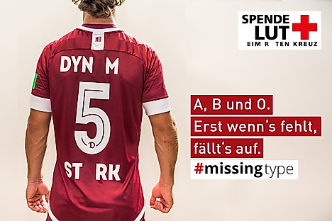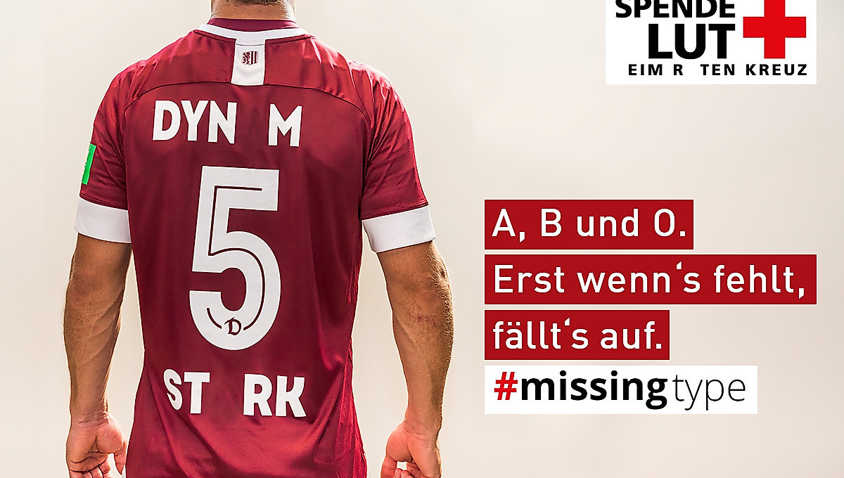 Anlässlich des Weltblutspendetages am 14. Juni nimmt die „Sp_rtgemeinsch_ft Dyn_m_ Dresden“ zusammen mit über 200 Unternehmen, Vereinen, Sportlern und Bands an der Kampagne der Blutspendedienste des Deutschen Roten Kreuzes „#missingtype – erst wenn’s fehlt, fällt’s auf!“ teil.Durch das symbolische Weglassen der Blutgruppen-Buchstaben A, B und O (steht für Blutgruppe 0) im Namen wird dabei auf die große Bedeutung von Blutspenden aufmerksam gemacht, von denen jeden Tag in Deutschland für die Versorgung von Kranken und Verletzten 15.000 benötigt werden.
