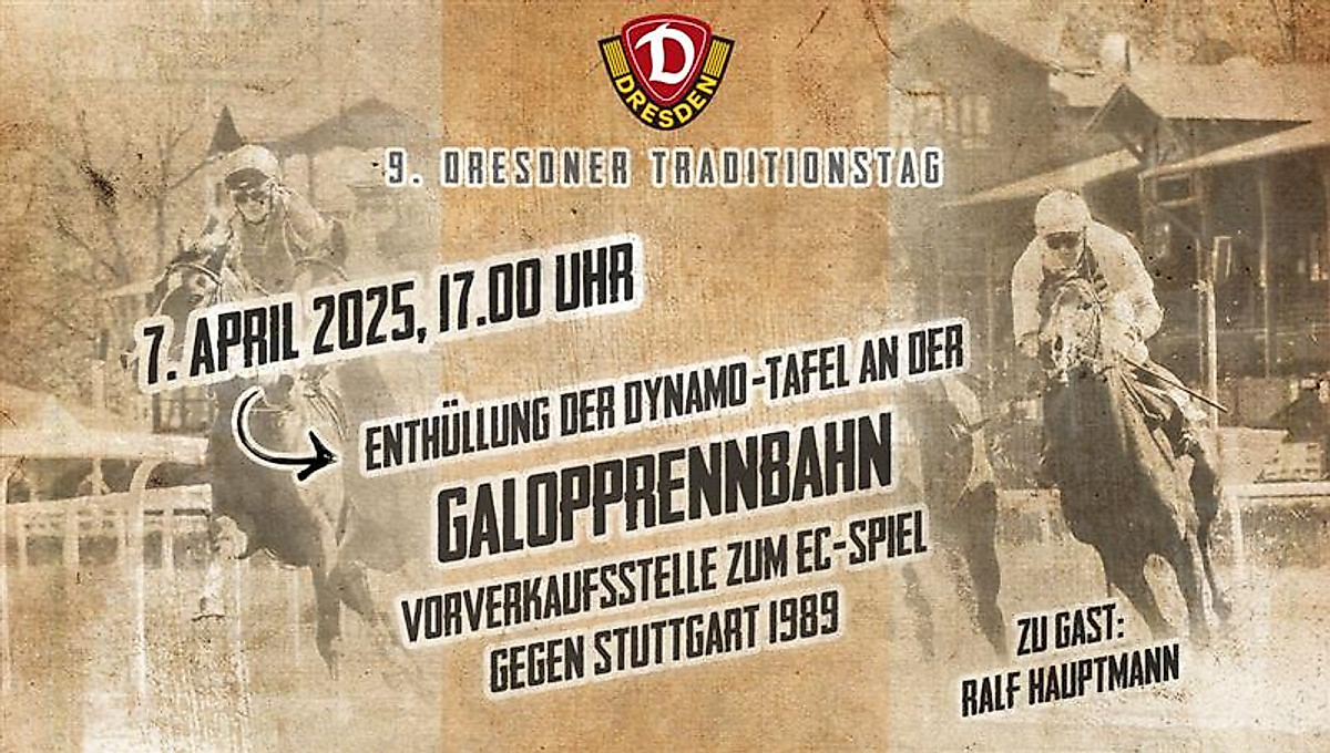 Am Montag, dem 7. April 2025, enthüllt die SGD eine Ehrentafel an der Galopprennbahn Dresden-Seidnitz, an der 1989 schwarz-gelbe Geschichte geschrieben wurde. Neben einer Führung von Dynamos Traditionsbeauftragtem Jens Genschmar habt Ihr die Möglichkeit, mit Präsident Ronny Rehn und Vereinslegende Ralf Hauptmann ins Gespräch zu kommen. Die Enthüllung erfolgt um 17 Uhr.
