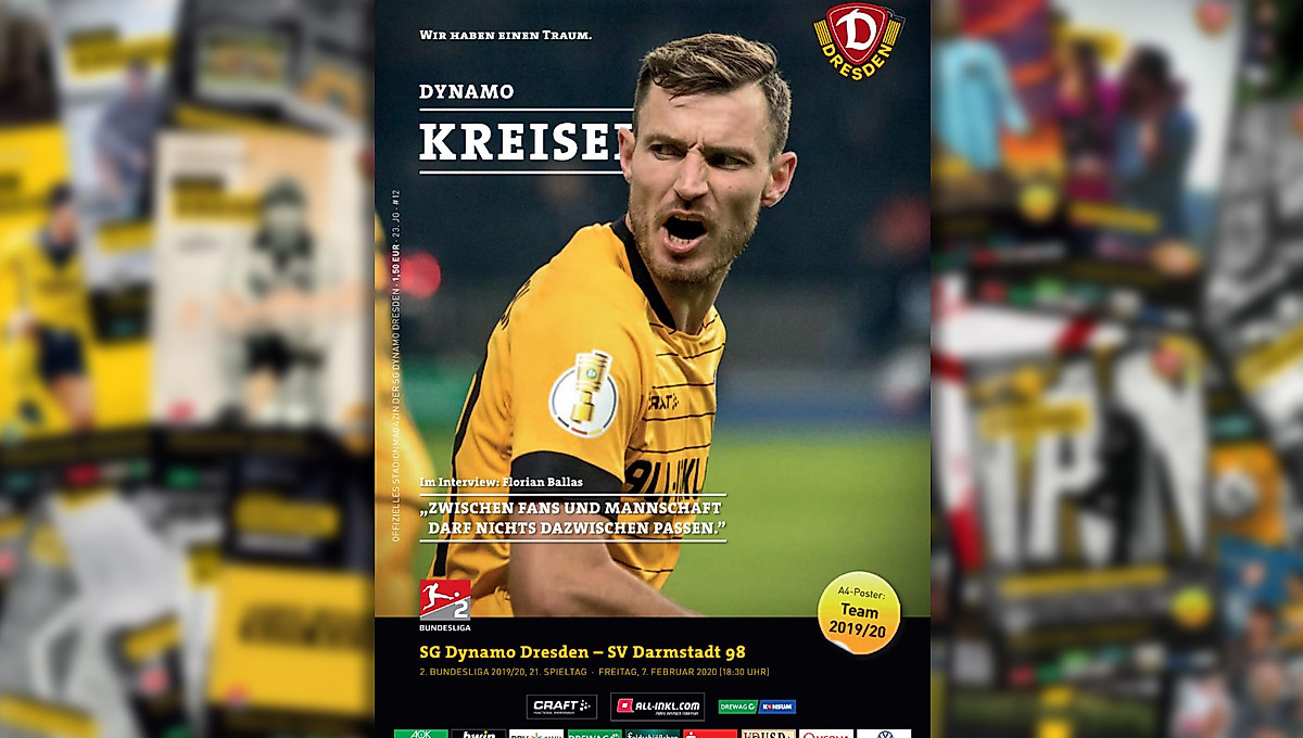 Diesmal findet ihr ihm Heft – wie immer mit zahlreichen Informationen rund um Dynamo und den Spieltag – ein Interview mit Florian Ballas. Dynamos neuer Kapitän ist seit nunmehr dreieinhalb Jahren ein Schwarz-Gelber mit Leib und Seele. Wir sprachen mit dem Verteidiger über seine neue Rolle mit der Binde am Arm, die prekäre sportliche Situation der SGD und wie die Mannschaft gemeinsam mit den Fans das große Ziel Klassenerhalt erreichen will.