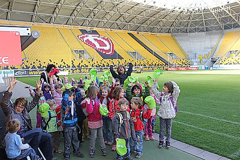 Zum Weltgeschichtentag am Donnerstag war das „glücksgas stadion“ einer von drei Erzählorten in Dresden. Wie schon im letzten Jahr verwandelte sich die Gästekabine in ein Märchenland. Kinder zwischen vier und zehn Jahren lauschten nach einer kurzen Stadionführung der Geschichte von Drachen und Ritter, die miteinander Verstecken spielen. Dass aus den fröhlich-lauten Rasselbanden gespannt lauschende Zuhörer wurden, dafür sorgte Jan Deicke. Mit seinem „mondschaafs Lauschpalast“ und dem Verein „Erzähl mir was!” hatte der professionelle Geschichtenerzähler die Veranstaltung wie im letzten Jahr organisiert.