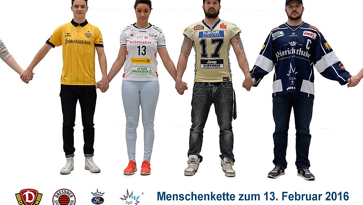 Die populärsten Dresdner Sportvereine – die Volleyballerinnen des Dresdner SC, die Footballer der Dresden Monarchs, die Fußballer der SG Dynamo Dresden und das Eishockey-Team der Dresdner Eislöwen – rufen alle Mitglieder, Mitarbeiter, Gremienvertreter, Sportler und Fans wie schon in den letzten Jahren dazu auf, sich am 13. Februar 2016 in die Menschenkette um die Dresdner Innenstadt einzureihen. Gemeinsam soll ein weit sichtbares Zeichen des Miteinanders gesetzt werden.Akzeptanz, Respekt und Fairness sind unverzichtbare Werte in der täglichen Arbeit der Vereine und im Umgang mit eigenen wie gegnerischen Spielern, Fans und Verantwortlichen. Was für die sportliche Leistung und den Erfolg unserer Teams in Nachwuchs- und professionellem Spielbetrieb zählt, sind Engagement, Wille, individuelle Fähigkeiten, Charakter und Moral. Hingegen haben Vorurteile, Gewalt, Nationalismus und Extremismus keinen Platz!