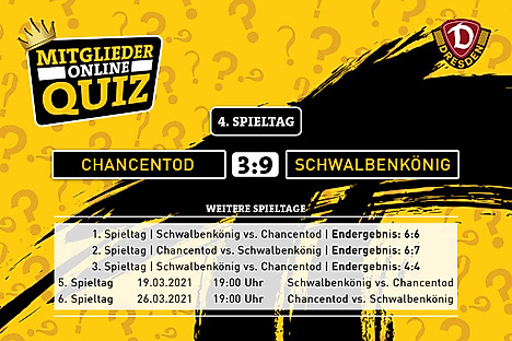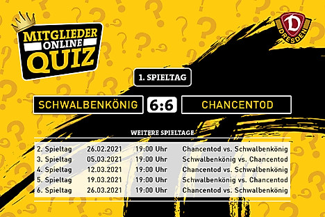 Am 3. Spieltag von Dynamos Mitglieder-Quiz trennten sich die beiden Teams „Schwalbenkönig“ und „Chancentod“ wie bereits am 1. Spieltag Unentschieden. 4:4 hieß das Endresultat am vergangenen Freitagabend, nachdem zuvor wieder viele interessante Fragen rund um den Fußball und die SGD gestellt worden waren.„Wir sind begeistert, dass unser Online-Quiz so gut angenommen wird. Das positive Feedback der Teilnehmer, die vielen Zuschaltungen an den Spieltagen sowie die zahlreichen bei uns eingehenden Antworten auf die wöchentlich gestellte, offene Quizfrage sprechen da eine eindeutige Sprache. Für Viele ist das gerade in dieser Zeit auf Abstand eine willkommene Abwechslung und Möglichkeit, Dynamo weiterhin nahe zu sein“, erklärt Quizmaster Holger Hums, der erneut am Freitag das nunmehr vierte Duell unter SGD-Mitgliedern leiten wird.