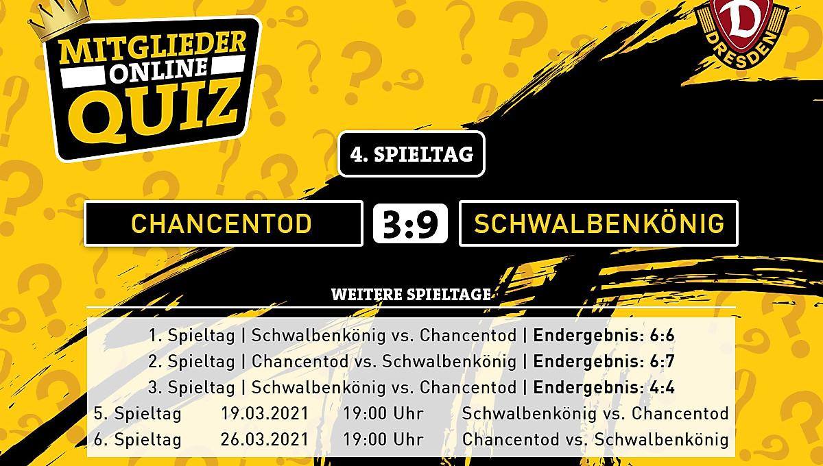 Der 4. Spieltag von Dynamos Mitglieder-Quiz hielt den ersten klaren Sieger des Duells parat: Das Team „Schwalbenkönig“ gewann „auswärts“ mit 9:3 gegen „Chancentod“.Als Überraschungsgast war zudem Ex-SGD-Spieler und heutiger Leiter von Dynamos Fußballschule Ralf Hauptmann zugeschaltet, der den Teams aus seiner aktiven Zeit je eine Frage stellte und diese im Anschluss mit seinem Hintergrundwissen ausführlich auflöste.