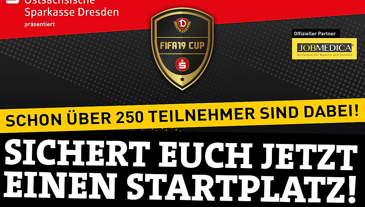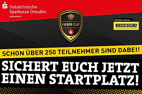Bereits über 250 Teilnehmer haben sich für den „1. Dynamo Dresden FIFA 19 Cup“, präsentiert von SGD-Exklusivpartner Ostsächsische Sparkasse Dresden und dem offiziellen Turnier-Partner JOBMEDICA, am Samstag, dem 21. September im Rudolf-Harbig-Stadion angemeldet.Sichert auch ihr euch euren Startplatz und meldet euch online für den "1. Dynamo Dresden FIFA 19 Cup" an. Die Bestellbestätigung per E-Mail reicht vor Ort als Nachweis aus. Ein Teamticket gilt für zwei Personen und kostet pro Person 15,- Euro.