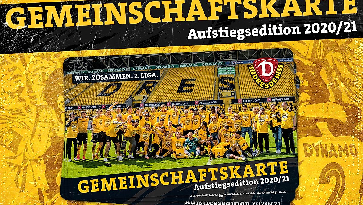 Etwas mehr als drei Wochen ist die Gemeinschaftskarte 2020/21 nun schon in drei verschiedenen Varianten erhältlich. Seither wurden bereits 8.329 der symbolischen Dauerkarten von Dynamo-Fans erworben, wodurch bisher über 165.000 Euro zusammengekommen sind.Aufgrund zahlreicher Nachfragen schwarz-gelber Anhänger, die sich auch eine Jahreskarte für ihre „Horni“ (Westtribüne) gewünscht haben und um unsere komplette Aufsteigermannschaft noch einmal gebührend zu würdigen, gibt es ab sofort eine vierte Gemeinschaftskarte zu erwerben – die Aufstiegsedition 2020/21.