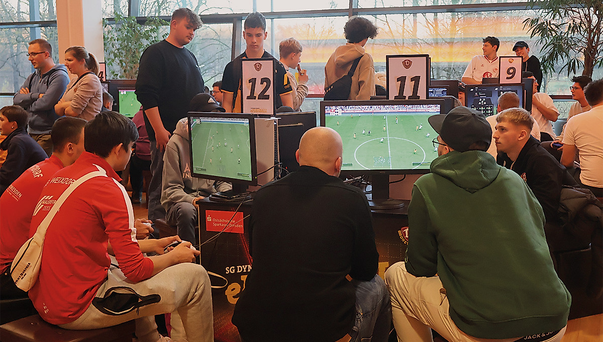 Rund 200 Gäste folgten der Einladung der SGD zum eFußball-Turnier in Dynamos Heimspielstätte. Insgesamt 108 aktive Teilnehmerinnen und Teilnehmer spielten im Modus Zwei-gegen-Zwei um den Turniersieg. Mit dabei waren auch die beiden Drittligaprofis Jonas Oehmichen und Paul Lehmann, die nachweisen konnten, dass sie auch auf dem virtuellen Rasen schwer zu schlagen sind. „Oehmi“ und „Paule“ kamen erfolgreich in der Gruppenphase weiter und schieden erst im Achtelfinale gegen die später Viertplatzierten des Tages aus.