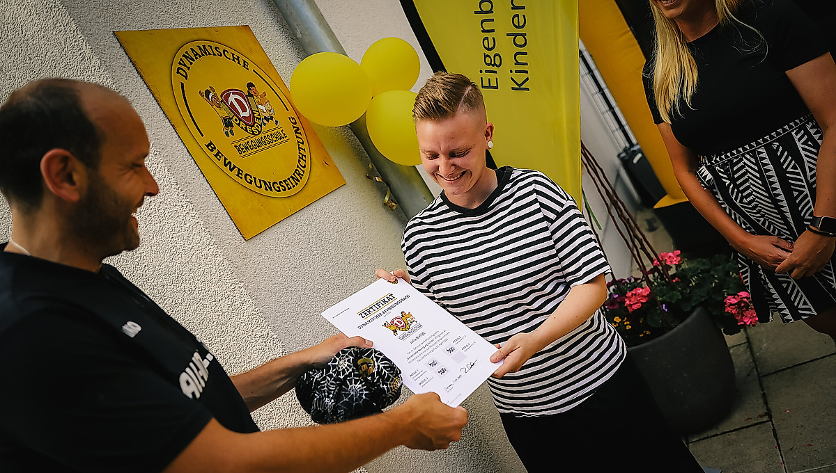 Am Freitag, dem 26 Juli, war die SG Dynamo Dresden Bewegungsschule in der Kindertageseinrichtung „Hopfgartenstraße 9“ zu Gast, um dieser offiziell die erste Plakette als „Dynamische Bewegungseinrichtung“ sowie der Erzieherin Julia Bieligk das erworbene Zertifikat zum „Dynamischen Bewegungscoach“ zu überreichen.