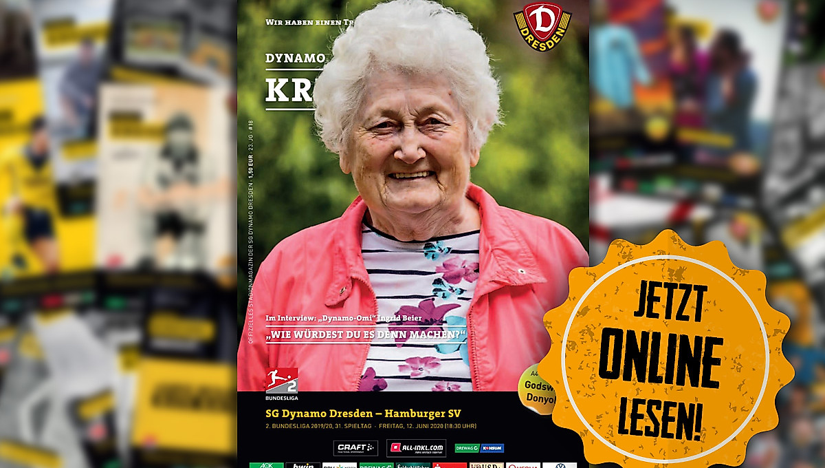 Für viele Schwarz-Gelbe gehört er zum Heimspiel wie Bratwurst und Bier: Der KREISEL. Auf Erstgenanntes und viele weitere Teile des Heimspiel-Erlebnisses im Rudolf-Harbig-Stadion müssen die Anhänger der SGD aktuell verzichten – nicht aber auf das Stadionmagazin.Ab sofort steht die aktuelle Ausgabe zum Heimspiel gegen den Hamburger SV online zur Verfügung. Darin findet ihr alle Infos rund um die Partie, ein Porträt unserer Gäste sowie ein ausführliches Interview mit "Dynamo-Omi" Ingrid Beier, die in wenigen Tagen ihren 90- Geburtstag feiert.