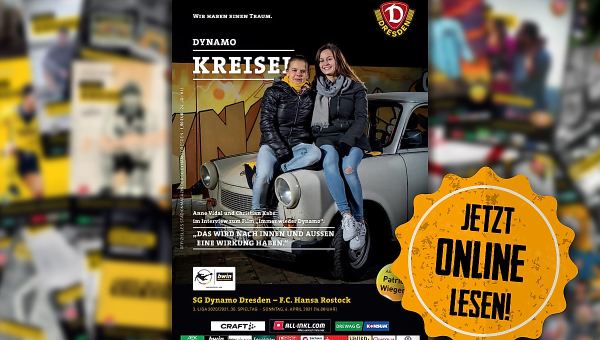Für viele Schwarz-Gelbe gehört er zum Heimspiel wie Bratwurst und Bier: Der KREISEL.Ab sofort steht die aktuelle Ausgabe zum Heimspiel gegen den F.C. Hansa Rostock online zur Verfügung. Darin findet ihr alle Infos rund um die Partie, ein Porträt unserer Gäste sowie ein Interview mit Anne Vidal und Christian Kabs, zwei der Akteure hinter dem Film "Immer wieder Dynamo".