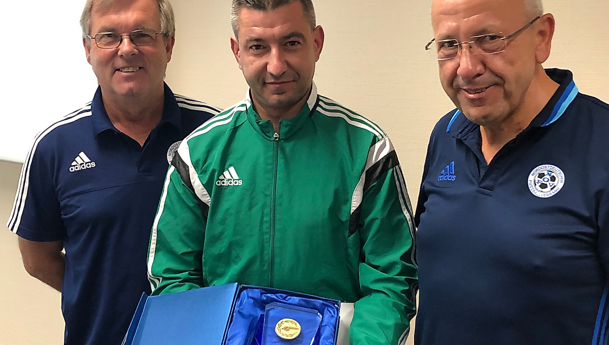 Leider war dem mittlerweile dienstältesten Schiedsrichter der Oberliga trotz seines 1. Platzes in der Leistungstabelle der Saison 2018/19 der Aufstieg in die Regionalliga aus Altersgründen nicht möglich. Ein Umstand, der die Freude über die Auszeichnung aber in keiner Weise trüben konnte.
