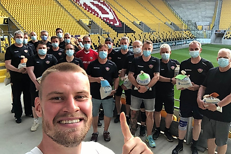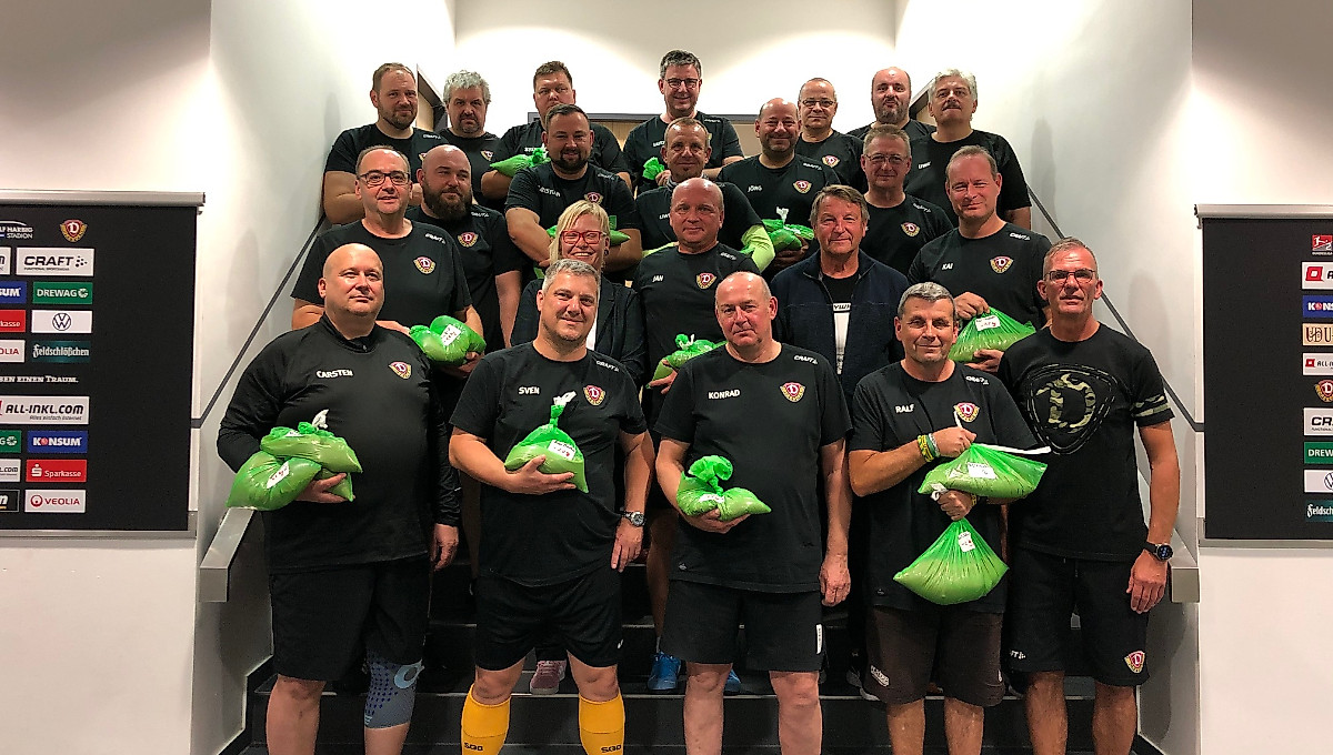 Am 22. Oktober trafen sich die Teilnehmer des Mitglieder-Angebotes "Fußballfans im Training" (FFIT) zum Bergfest im Rudolf-Harbig-Stadion. Im Beisein von Aufsichtsrats-Mitglied und Ehrenspielführer "Dixie" Dörner wurde ein erfolgreiches Zwischenfazit gezogen.Der 20 Männer umfassende Kurs legte in den ersten sechs Wochen mehr als 6,9 Millionen Schritte zurück. Trainer Holger Hums und "Dixie" Dörner übergaben zudem jedem Teilnehmer einen mit Sand befüllten Beutel, der dem Gewicht entspricht, welches bisher abgenommen wurde. Der Bestwert unter allen Teilnehmern lag bei neun Kilogramm – der Kurs darf sich über eine Gesamt-Gewichtsreduktion von mehr als 107 Kilogramm freuen. "Kein Wunder, da sich die Männer über das Kursangebot hinaus auch privat zum Nordic Walking um den Großen Garten treffen", erklärte Holger Hums.