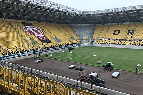 Die rund 8.000 Quadratmeter große Spielfläche soll am 8. Dezember abgetragen und anschließend durch einen neuen Rasen ersetzt werden. Das neue Grün für Dynamos Wohnzimmer, bestehend aus Rispen- und Weidelgrassorten, stammt aus der Nähe von Schwerin und wird in knapp 20 LKW-Lieferungen nach Dresden transportiert.