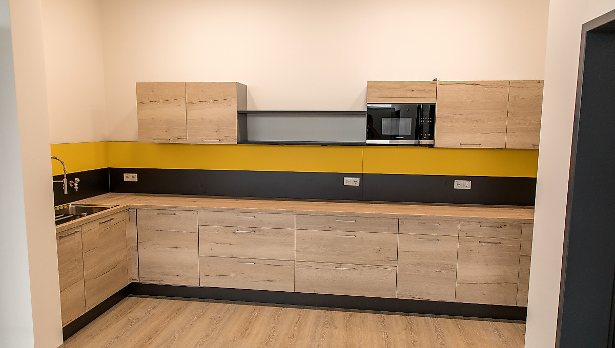 So hat unter anderem das Küchenhaus Hilligden Einbau der Teeküchen vorgenommen. Inhaber Steffen Hillig erklärt dabei, wo die insgesamt sechs Küchenzeilen unter anderem im Wirtschaftsgebäude, dem PK-Raum oder der Kabine der Profis ihren Platz gefunden haben und was dabei zu beachten war.
