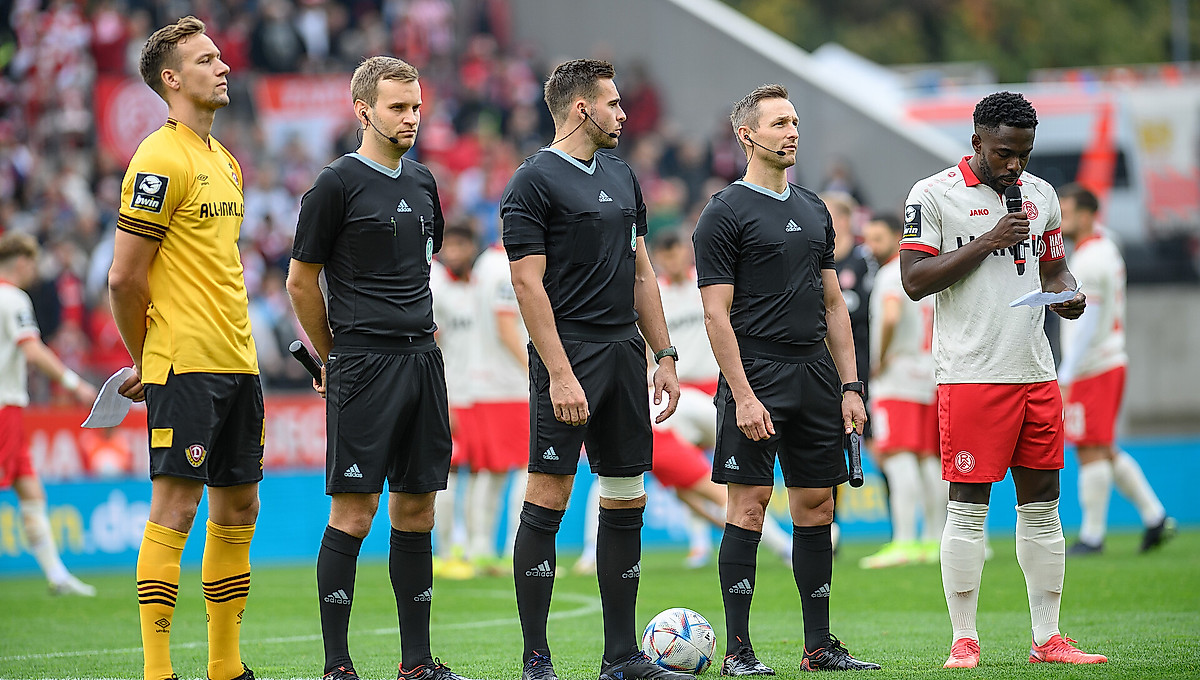 Vor dem Anstoß des Auswärtsspiels der SG Dynamo Dresden bei Rot-Weiss Essen verlasen die Kapitäne beider Mannschaften Botschaften ihrer Vereine im Stadion an der Hafenstraße.