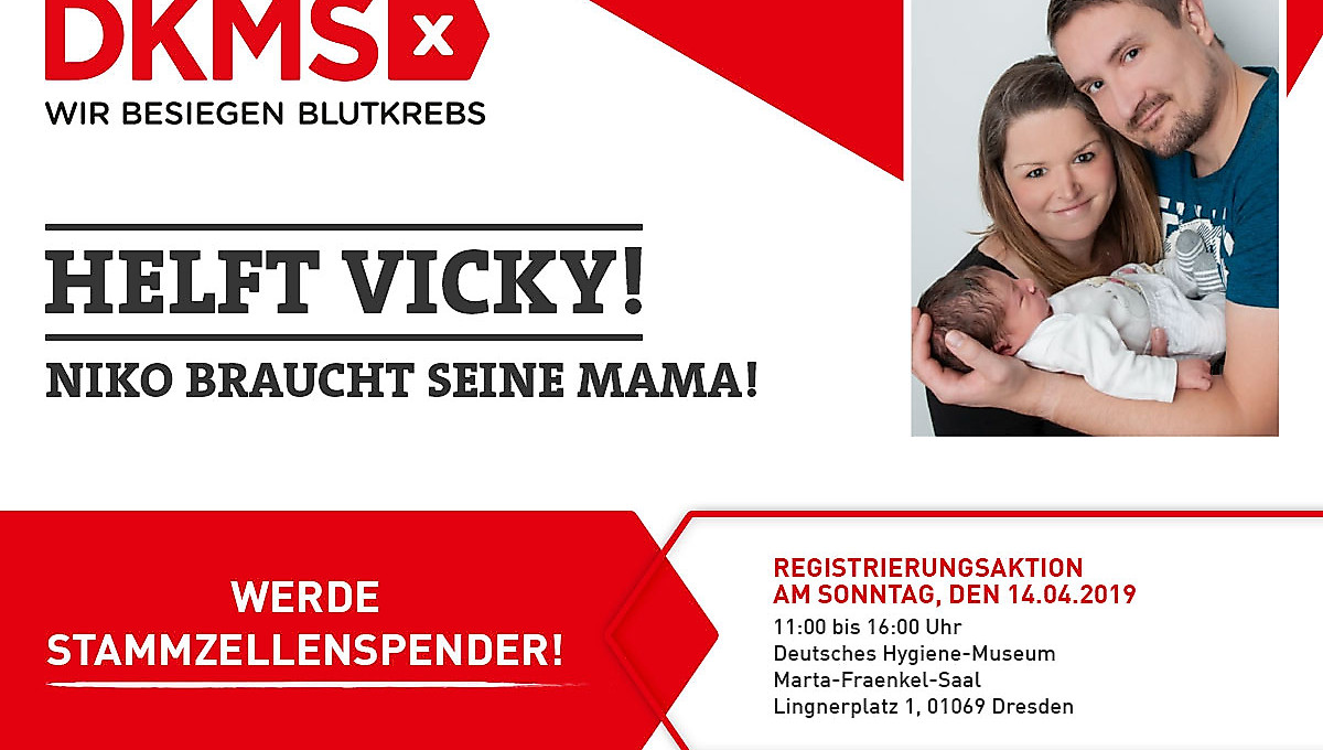 Die DKMS organisiert für Vicky und alle anderen an Blutkrebs erkrankten Patienten am Sonntag, dem 14.04., eine große Registrierungsaktion im Deutschen Hygiene-Museum: