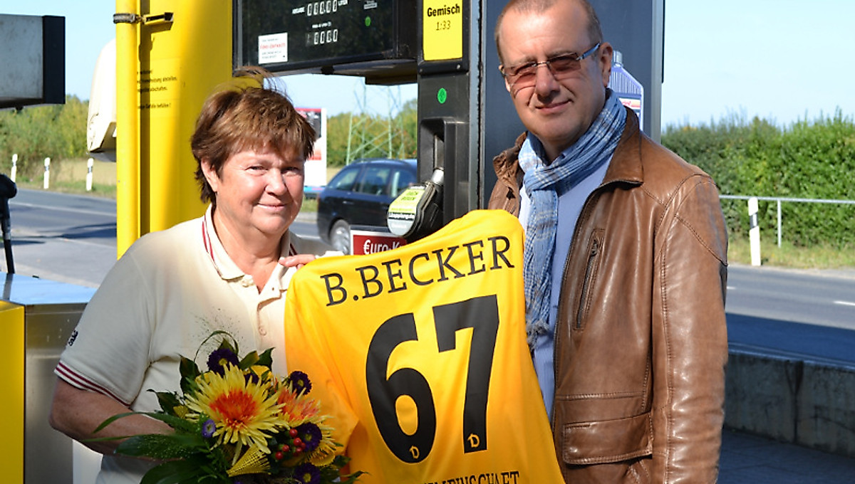 Am letzten Arbeitstag übereichte Dynamo-Präsident Andreas Ritter der langjährigen Inhaberin ein von den Profis unterschriebenes Spielertrikot mit ihren Initialen und bedankte sich für das jahrelange Engagement an einer außergewöhnlichen Tankstelle, die auch auf ihre Initiative hin ins Leben gerufen wurde. Barbara Becker freute sich über den Besuch und versicherte, der Sportgemeinschaft auch weiterhin erhalten zu bleiben. „Herr Ritter hat mich wirklich überrascht. Das Trikot wird einen Ehrenplatz bekommen. Nun habe ich auch mehr Zeit, um ins Stadion zu gehen. Darauf freue ich mich sehr“, sagte sie.