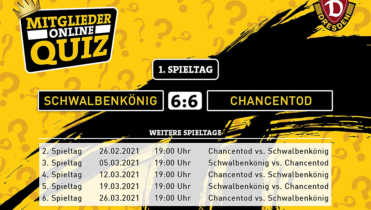 Am 19.02. fand der erste von insgesamt sechs Spieltagen von Dynamos Online-Mitgliederquiz statt. Steffen und Joachim vom Team „Schwalbenkönig“ trafen dabei auf Karsten und Uwe vom Team „Chancentod“ und lieferten sich ein enges Rennen, das letztlich in einem 6:6-Unentschieden endete.Neben den vier Spielern fieberten 30 weitere SGD-Mitglieder im virtuellen Quiz-Raum mit und kamen selbst das ein oder andere Mal ins Grübeln, als Spielleiter Holger Hums jedem Quiz-Duo je sieben Fragen zur SGD, eine Frage zur Nationalmannschaft, eine Frage zum Weltfußball sowie eine Frage zur Regelkunde stellte.
