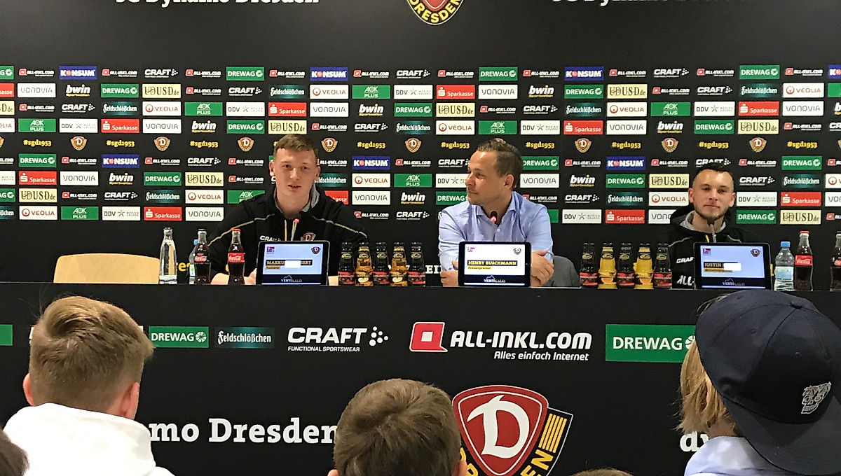 Genauso wie bei einer richtigen Pressekonferenz betraten die beiden SGD-Kicker schließlich das Podium im PK-Raum zusammen mit Dynamo-Pressesprecher Henry Buschmann, der eine Stunde lang durch die Fragerunde führte.