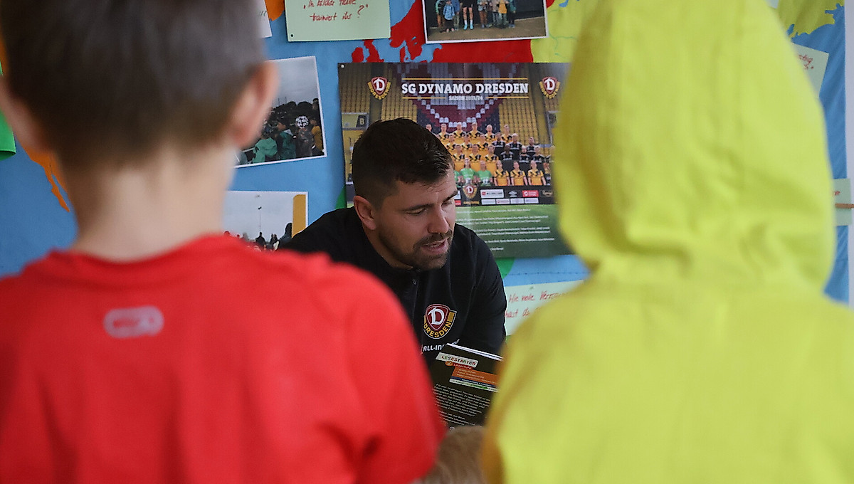 In den verschiedenen Einrichtungen lasen alle drei Dynamos zunächst einige Passagen aus den unterschiedlichsten Büchern. So wurden im Gymnasium Bürgerwiese von Paul Lehmann einige Zeilen aus der Biografie von Zlatan Ibrahimovic gelesen, Benny Kirsten las im Kindergarten Lichtspiel aus dem Kinderbuch von Thomas Müller „Mein Weg in die Startelf“ und im Förderzentrum Oberes Erzgebirge lauschten die Schülerinnen und Schüler Patrick Wiegers, der Geschichten aus dem Buch „Oliver Kahn – Nummer eins“ zum Besten gab.