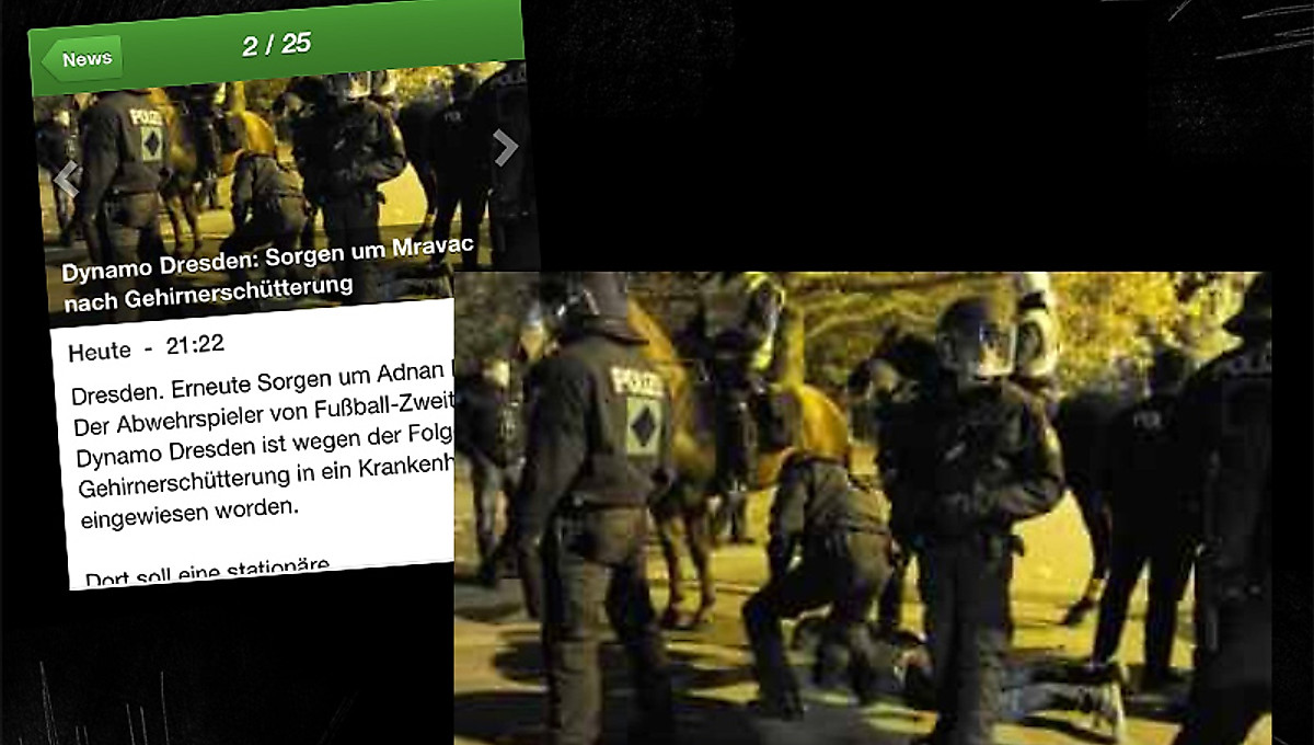 ich wende mich an Sie in Ihrer Funktion als Geschäftsführer der motain GmbH, welche die Fußball-App „iLiga“ entwickelt und vermarktet. Im Nachrichten-Bereich der iLiga-App wurde am Mittwoch, dem 27.11.2013, um 21:22, über unseren Spieler Adnan Mravac berichtet. Grundlage war eine vereinsseitige Veröffentlichung, in der mitgeteilt wurde, dass der Spieler aufgrund der Folgen einer Gehirnerschütterung in ein Dresdner Krankenhaus eingewiesen werden musste. Die Überschrift der betreffenden iLiga-News lautet „Dynamo Dresden: Sorgen um Mravac nach Gehirnerschütterung“. In dieser News geht es ausschließlich um die Verletzung des Spielers, auch enthält sie ein Zitat mit Genesungswünschen unseres Cheftrainers Olaf Janßen.Grund meines Schreibens ist das Bild, welches der News vorangestellt ist. Dort ist weder der Spieler Adnan Mravac zu sehen, noch wurde ein geeignetes Symbolbild mit Dynamo-Bezug verwendet. Stattdessen wurde die Nachricht über die Verletzung von Adnan Mravac mit einem Foto eines Polizeieinsatzes versehen, auf dem erkennbar eine Person am Boden liegend von einem Polizisten festgehalten wird. Nicht erkennbar ist, ob es sich um einen Polizeieinsatz bei einem Fußballspiel handelt.